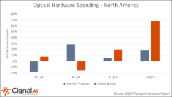 September, 2, 2025, Boston--Cignal AIの暫定的な 2Q25 Transport Hardware & Marketsレポートによると、世界の光トランスポート市場は2Q25に成長に戻り、前年同期比9%増の38億ドルになった。