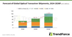 TrendForceは、800G以上の光トランシーバモジュールの世界の出荷シェアが2024年の19.5%から2026年には60%以上に上昇し、AI重視データセンタにおける標準コンポーネントとなると推定している。