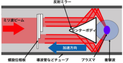 July, 25, 2025, 仙台--東北大学大学院工学研究科の高橋聖幸准教授と山田峻大大学院生(研究当時)、筑波大学 数理物質系 / プラズマ研究センターの南龍太郎准教授と假家強教授、東京都立大学大学院システムデザイン研究科の嶋村耕平准教授らは、独自に開発した「マイクロ波駆動管内加速器」による推力生成実験を行った。螺旋位相板を用いてミリ波ビームを光渦ビームへ変換し、機体後方にプラズマを生成することで、チューブ内でロケットを加速させることに世界で初めて成功した。