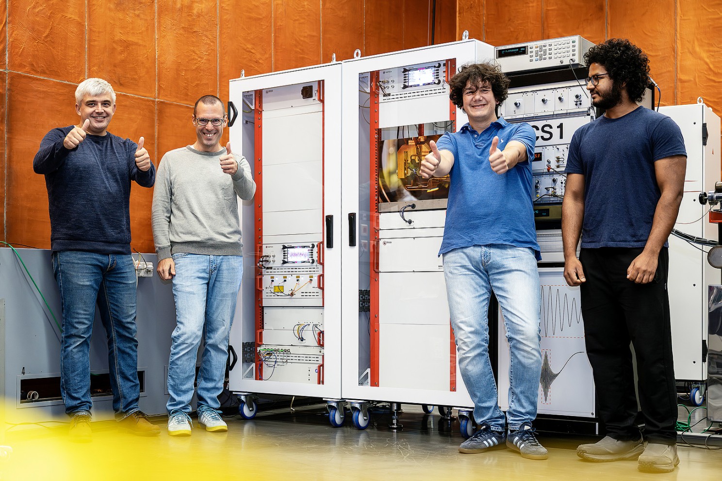 TOPTICLOCKシステムを分解しウィーンへ発送する直前、士気は高まっていた。PTB のクロックホールでポーズを取っているのは Nils Huntemann (PTB)、Axel Friedenauer 、 Pierre Thoumany (TOPTICA)、 Saaswath Jeyalathaa Karthikeyan (PTB) 。(写真:PTB)
