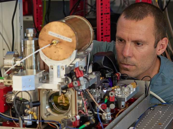 「こちらをご覧ください。」 Nils Huntemann は、原子時計ホールの前方にある二つの白い二重キャビネットを指差します。「これが Opticlock と TOPTICLOCK、いわば姉妹のようなものです。」これらの光原子時計は、それぞれ二つの白いスチール製筐体に収められており、レーザーシステム、イオントラップ、光学共振器など、必要なものすべてが含まれています。
