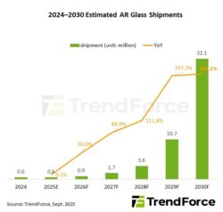 September, 12, 2025, Taipei--TrendForce の最新レポート「2025 年のニアアイ ディスプレイ市場の見通しと技術分析」によると、ARグラス市場は 2025 年に勢いを増していることが明らかになった。これは、国際ブランドがプロトタイプを発表し、Meta が Celeste ARグラスの発売を準備しているためである。OLEDoS製品価格の下落と相俟って、世界のAR出荷台数は2025年に60万台に達すると予想されている。