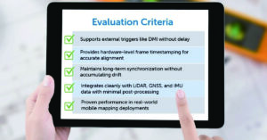 カメラシステムでは、解像度、鮮明さ、校正といったことが話題になる。しかし、カメラ、LiDAR、その他のセンサが一緒に稼働するモバイルマッピングシステムでは、すべてを同期させなければ、どれひとつ機能しない。