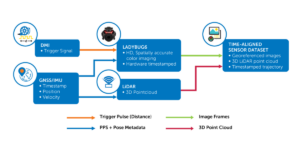 GNSS受信機から出力される1秒あたりのパルス数(PPS)信号と組み合わせることで、すべての取得フレーム(画像、点群、内部測定ユニット(IMU)データ)を、時間・空間的に単一の正確な瞬間に合わせることができる。