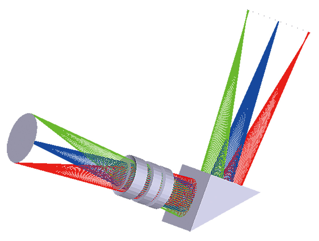 図1 マシンビジョンアプリケーション用の照明を開発するには、光物理学の基本的な理解が役立つ。例えば、光学設計における光線追跡(Optical Design RayTrace、レンズを通過する光線の経路をシミュレーションするための計算手法)である(提供:オートメーテッド・ビジョン・システムズ社)